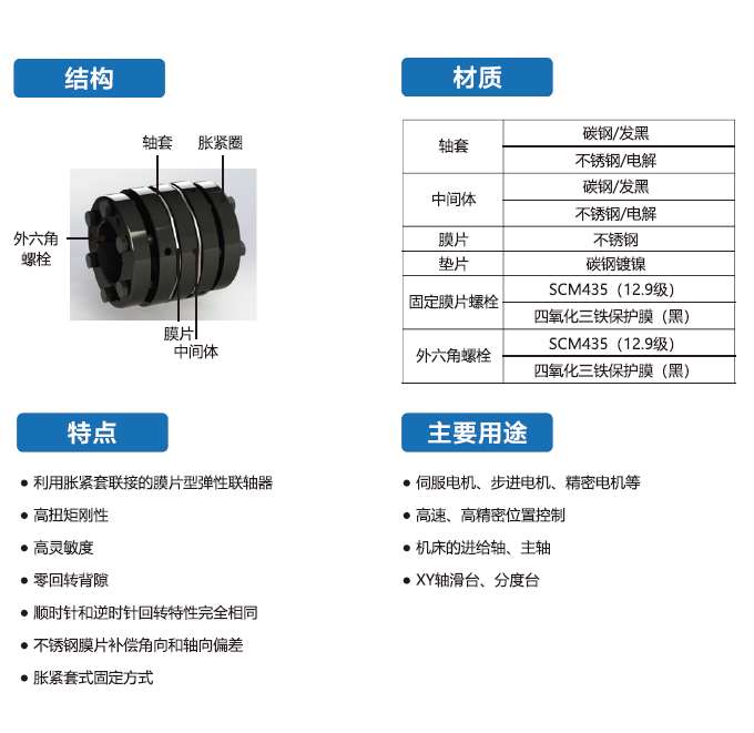 HSFPS-T系列联轴器采用碳钢发黑,利用胀紧套联接的膜片型弹性联轴器,广泛用于伺服电机、步进电机、精密电机等。