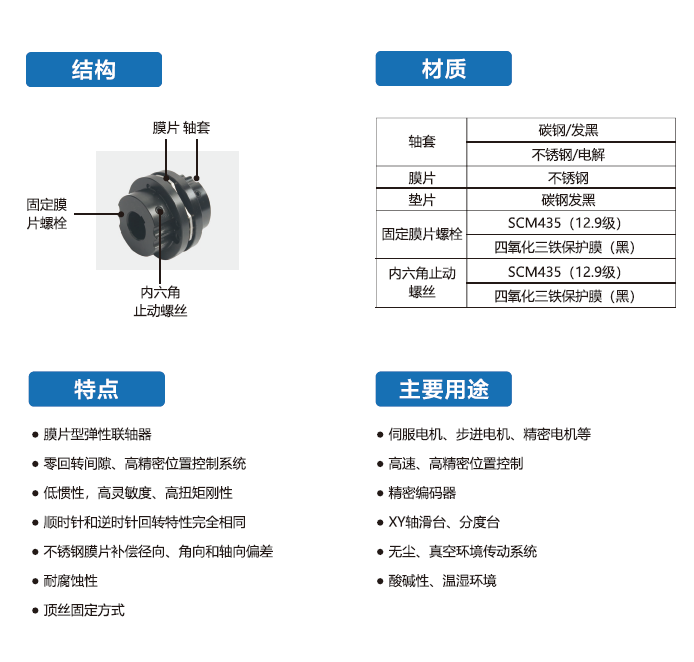 DFPS-G系列联轴器采用碳钢发黑,利用胀紧套联接的膜片型弹性联轴器,广泛用于伺服电机、步进电机、精密电机等。