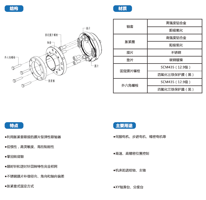 DFP-T系列联轴器采用高强度铝合金材料,经过阳极氧化处理,广泛用于伺服电机、步进电机、精密电机等。