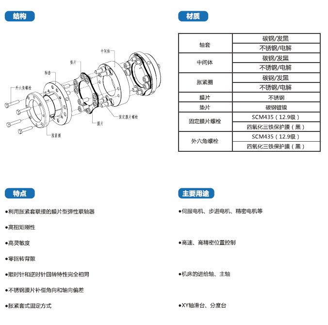 SFPS-T系列联轴器采用碳钢发黑,利用胀紧套联接的膜片型弹性联轴器,广泛用于伺服电机、步进电机、精密电机等。