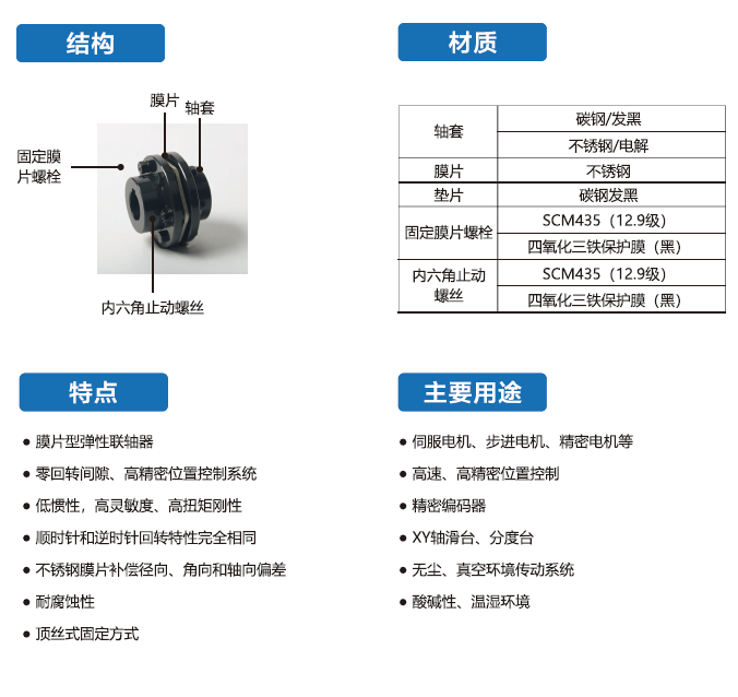 HDJP-G系列联轴器采用碳钢发黑,利用胀紧套联接的膜片型弹性联轴器,广泛用于伺服电机、步进电机、精密电机等。