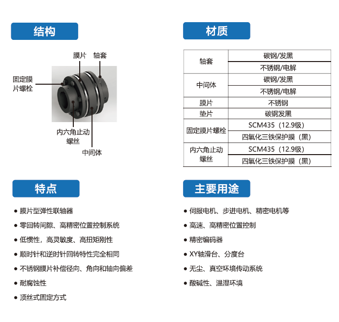 HSJP-G系列联轴器采用碳钢发黑,利用胀紧套联接的膜片型弹性联轴器,广泛用于伺服电机、步进电机、精密电机等。