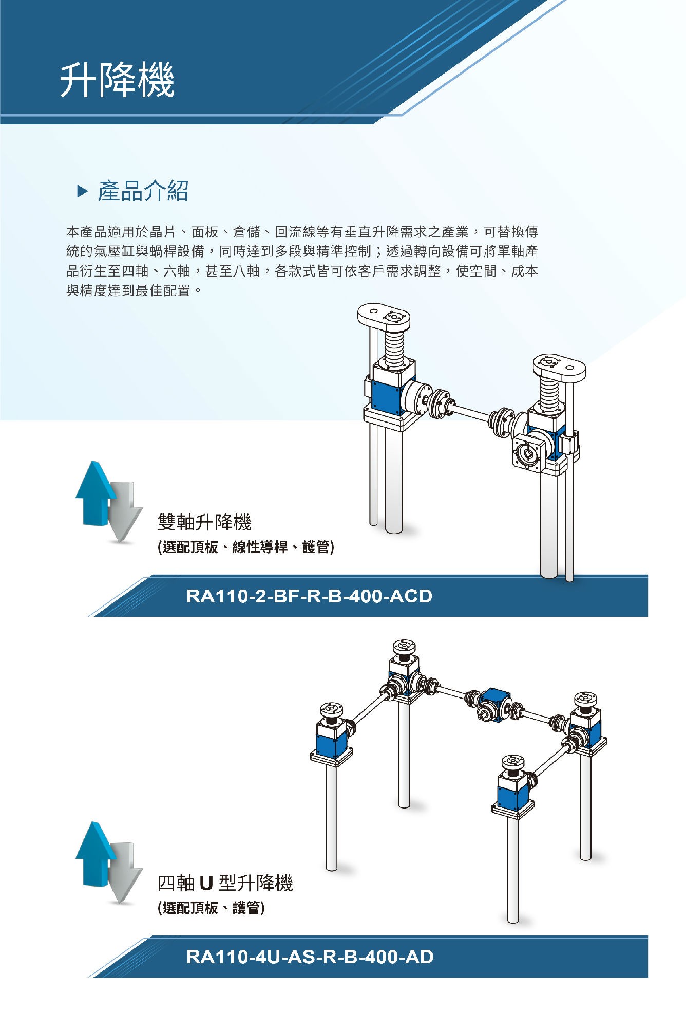 2BF系列双轴升降机可选配顶板。适用于晶片、面板、仓储、回流线等有垂直升降需求的产业,可替换传统的气压罐与蜗杆设备,同时达到多段与精准控制。