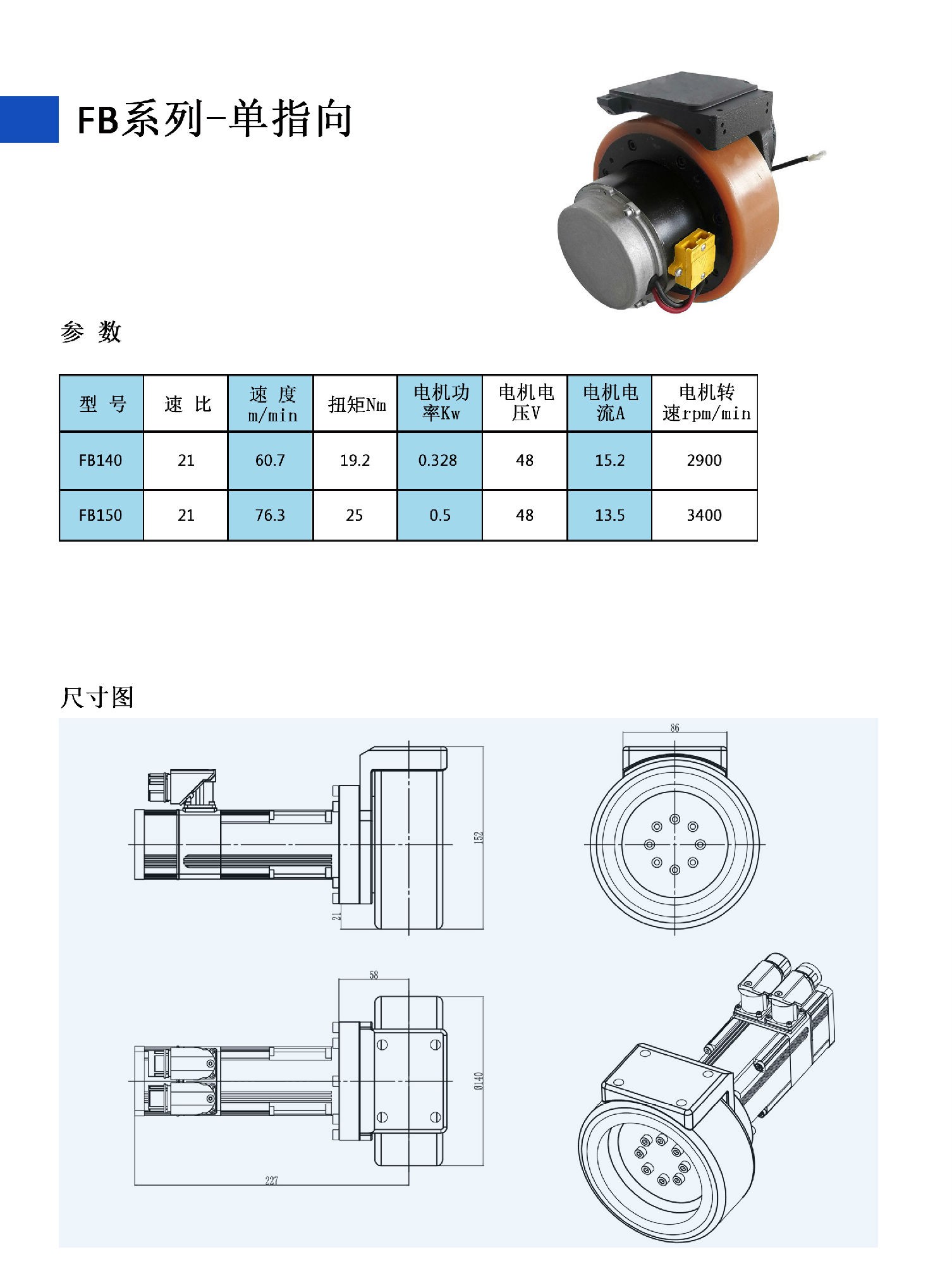 FB系列舵轮组,单指向型。差速驱动轮组模块,在原有舵轮组的基础上,进行深度设计,将减速机和驱动轮设计一体化,加外接直流电机,成为高度集成的机电一体化AGV行走驱动轮组组件。