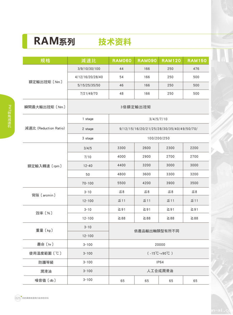 RAM系列是品宏转角减速机系列。 铝合金材质可提高散热能力,减缓温升现象造成影响。 多样化的出力轴可因应各种场合,客制化的入力端可搭配各式马达。 提供各式特色之减速机,供使用者依需求选购。 特殊油封设计,正常使用下不需保养亦不用更换润滑油,可延长使用寿命。 各式特色,体积小,省空间,噪音低,输出扭矩高,安装容易,可搭配马达型号广泛。 RAM搭配DM,一体成型的齿轮组,可有效的减低噪音。 RAM搭配DH,最佳的性价比,可广泛应用于各种场合。
