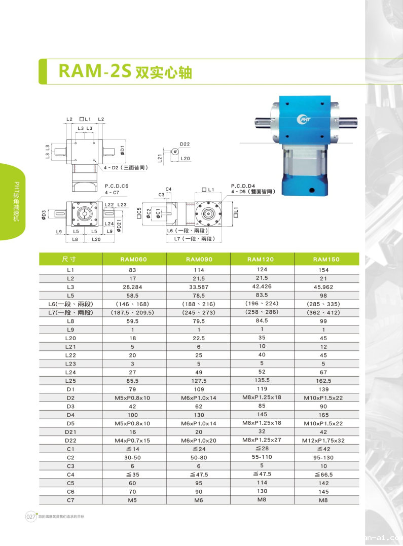PHT(品宏行星减速机) RAM-2S系列是双实心轴设计。 铝合金材质可提高散热能力,减缓温升现象造成影响。 多样化的出力轴可因应各种场合,客制化的入力端可搭配各式马达。 提供各式特色之减速机,供使用者依需求选购。 特殊油封设计,正常使用下不需保养亦不用更换润滑油,可延长使用寿命。 各式特色,体积小,省空间,噪音低,输出扭矩高,安装容易,可搭配马达型号广泛。 RAM搭配DM,一体成型的齿轮组,可有效的减低噪音。 RAM搭配DH,最佳的性价比,可广泛应用于各种场合。