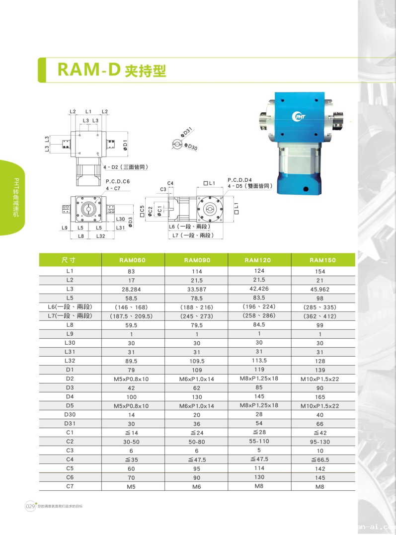 RAM-D系列是夹持型设计。 铝合金材质可提高散热能力,减缓温升现象造成影响。 多样化的出力轴可因应各种场合,客制化的入力端可搭配各式马达。 提供各式特色之减速机,供使用者依需求选购。 特殊油封设计,正常使用下不需保养亦不用更换润滑油,可延长使用寿命。 各式特色,体积小,省空间,噪音低,输出扭矩高,安装容易,可搭配马达型号广泛。 RAM搭配DM,一体成型的齿轮组,可有效的减低噪音。 RAM搭配DH,最佳的性价比,可广泛应用于各种场合。
