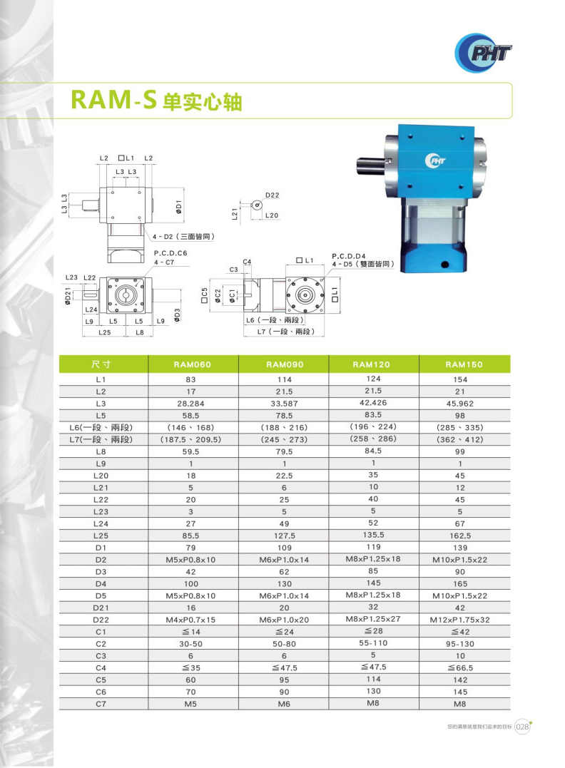 RAM-S系列是单实心轴设计。 铝合金材质可提高散热能力,减缓温升现象造成影响。 多样化的出力轴可因应各种场合,客制化的入力端可搭配各式马达。 提供各式特色之减速机,供使用者依需求选购。 特殊油封设计,正常使用下不需保养亦不用更换润滑油,可延长使用寿命。 各式特色,体积小,省空间,噪音低,输出扭矩高,安装容易,可搭配马达型号广泛。 RAM搭配DM,一体成型的齿轮组,可有效的减低噪音。 RAM搭配DH,最佳的性价比,可广泛应用于各种场合。