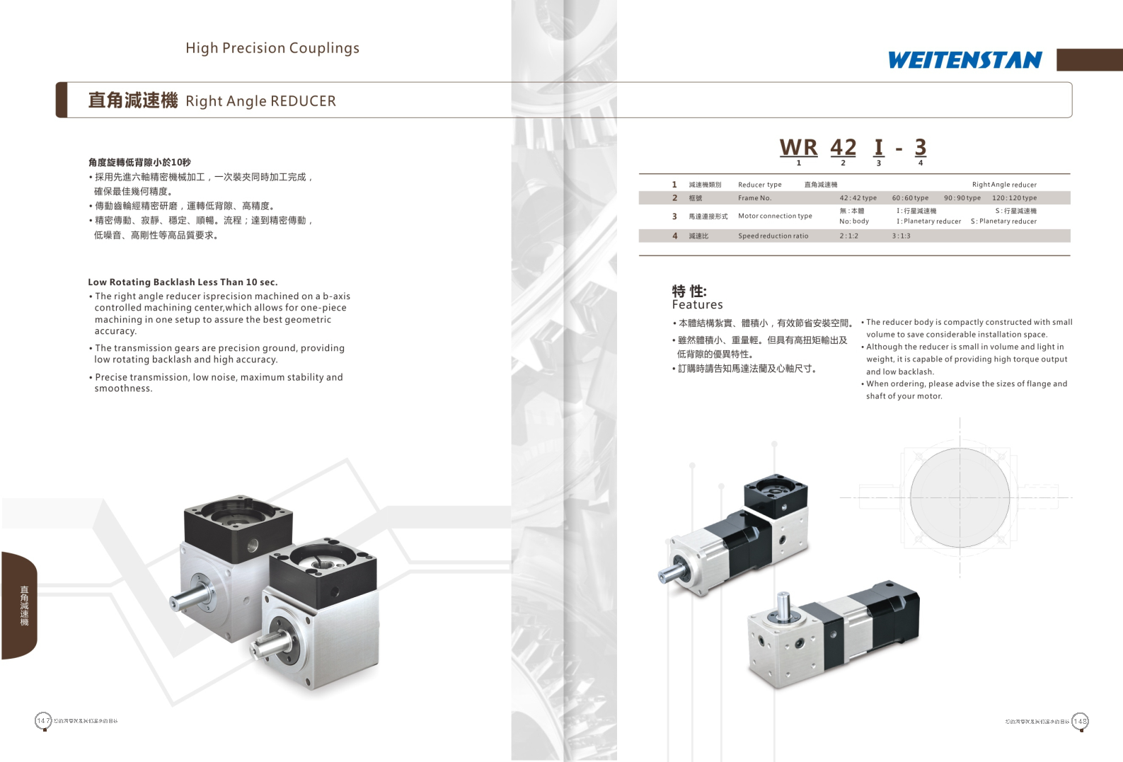 WR系列直角减速机。 角度旋转低背隙小于10秒。 采用先进六轴精密机械加工,一次装夹同时加工完成,确保最佳几何精度。 传动齿轮经紧密研磨,运转低背隙、高精度。 精密传动、寂静、稳定、顺畅。流程:达到精密传动,低噪音,高刚性等高品质要求。 本体结构扎实,体积小,有效节省安装空间。 虽然体积小,重量轻,但具有高扭矩输出及低背隙的优异特性。