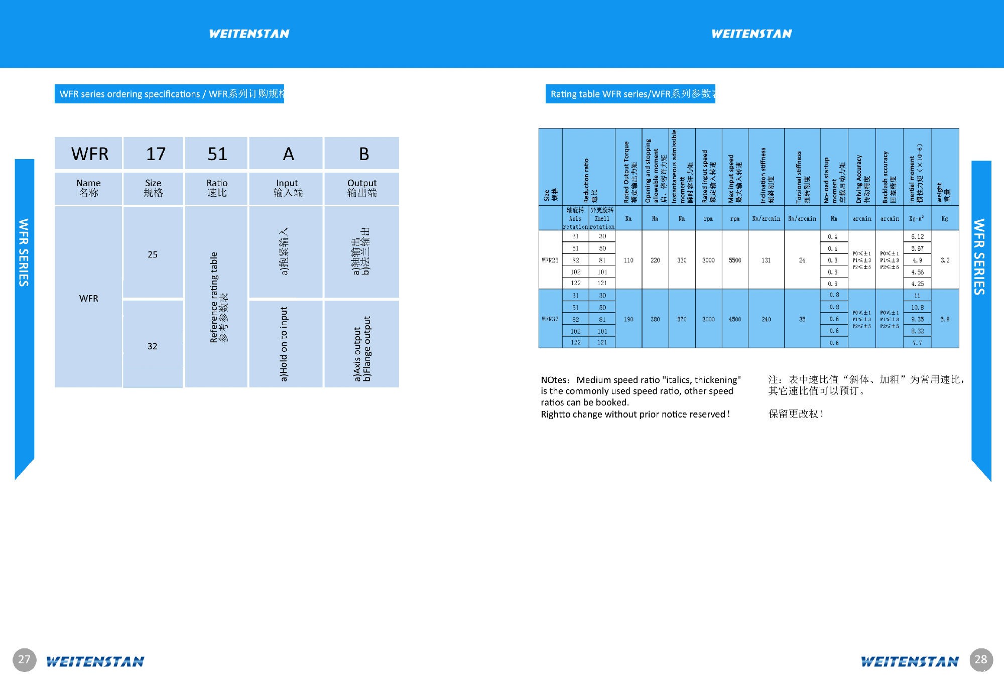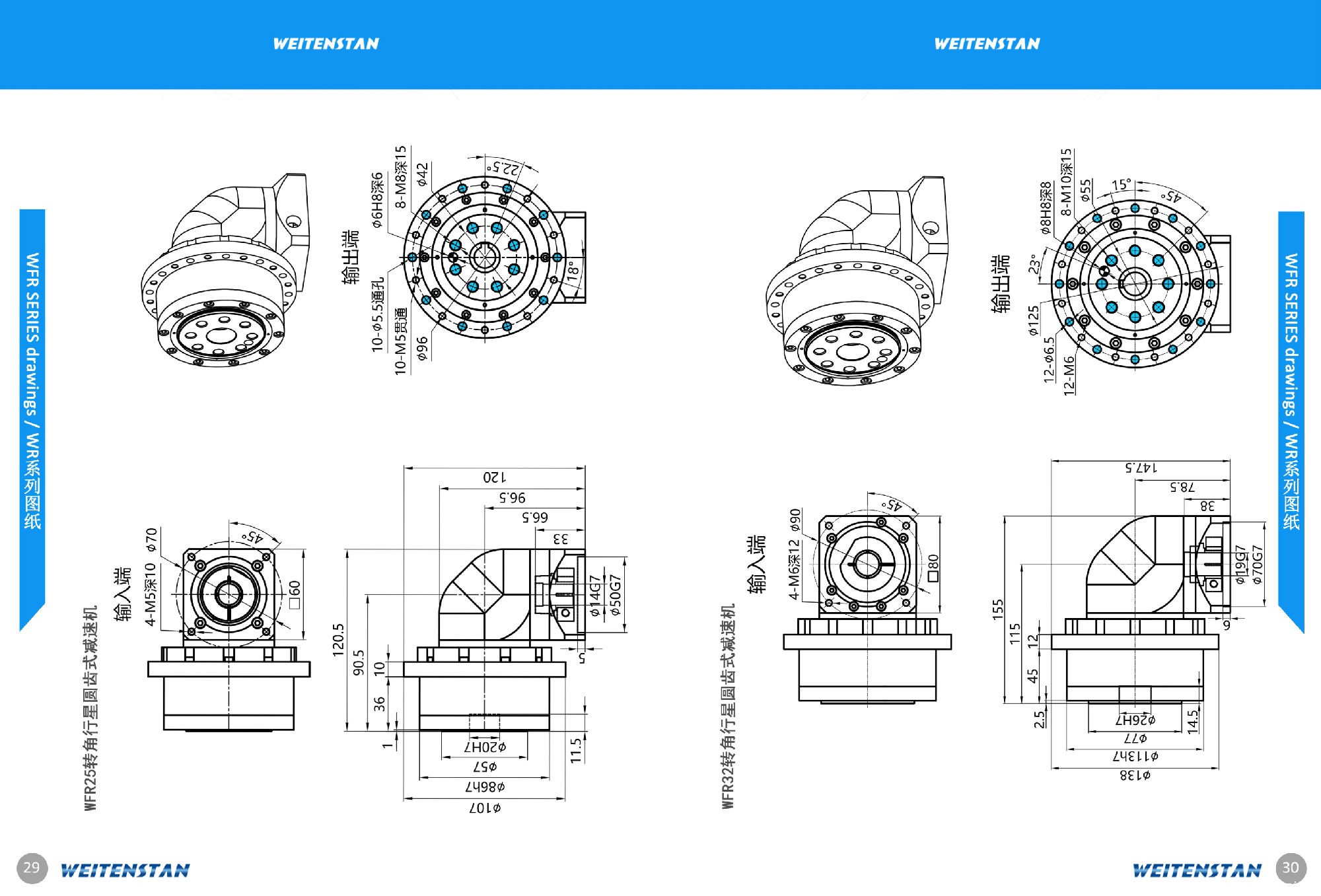 WFR系列时带法兰的高精度减速机,其特点时输入和输出的角度为90°,可大大节省安装空间、模块化设计可以通过法兰安装电机和减速机。