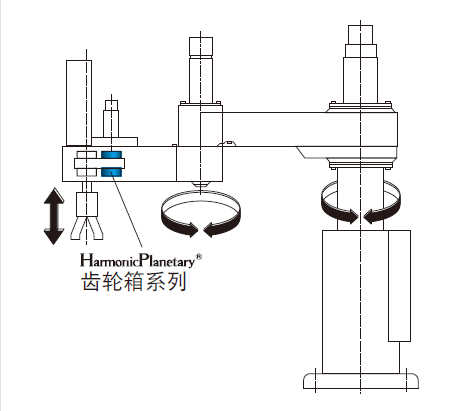 水平多关节工业机器人,包括底座,底座上设置有下臂,下臂上设置有上臂,上臂的右侧设置有驱动电机、主动带轮、从动带轮、花键轴、谐波减速机以及传动轴,驱动电机竖直设置在主动带轮的上方,主动带轮在驱动电机的驱动下进行转动,从动带轮设置在主动带轮的右侧并通过同步带与主动带轮同步转动,从动带轮的中心竖直设置有传动轴,传动轴贯穿从动带轮且向下延伸形成延伸部,谐波减速机设置在传动轴的延伸部上,传动轴的中心设置有花键轴,花键轴贯穿谐波减速机并向外延伸,谐波减速机通过花键母与传动轴固定连接。