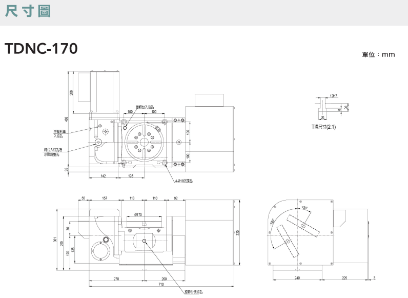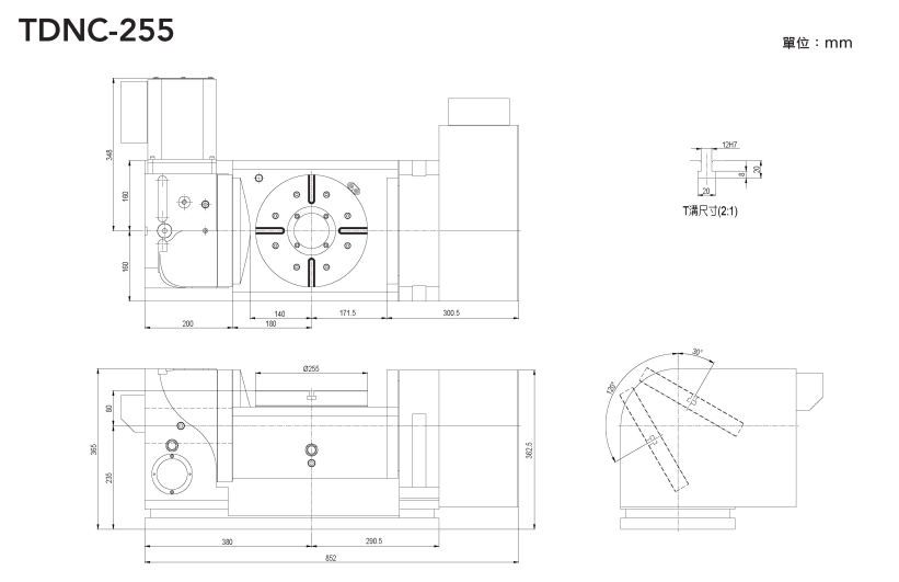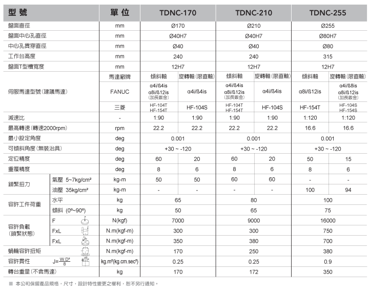 TDNC五轴摇篮式分度盘 CNC数控分度盘摇篮式五轴结构特点: 1、 采用进口双导程蜗杆、涡轮,涡轮采用铝青铜合金,传动定位精度高; 2、 涡轮大小接近盘面大小,不偷工减料,刚性比同类产品要强30%-50%; 3、 提供高准确和高效能的生产; 4、 摇摆结构配置倾斜轴中心线与旋转盘面高度一致,可承受更多的加工扭力和减少机器垂直行程的干涉。